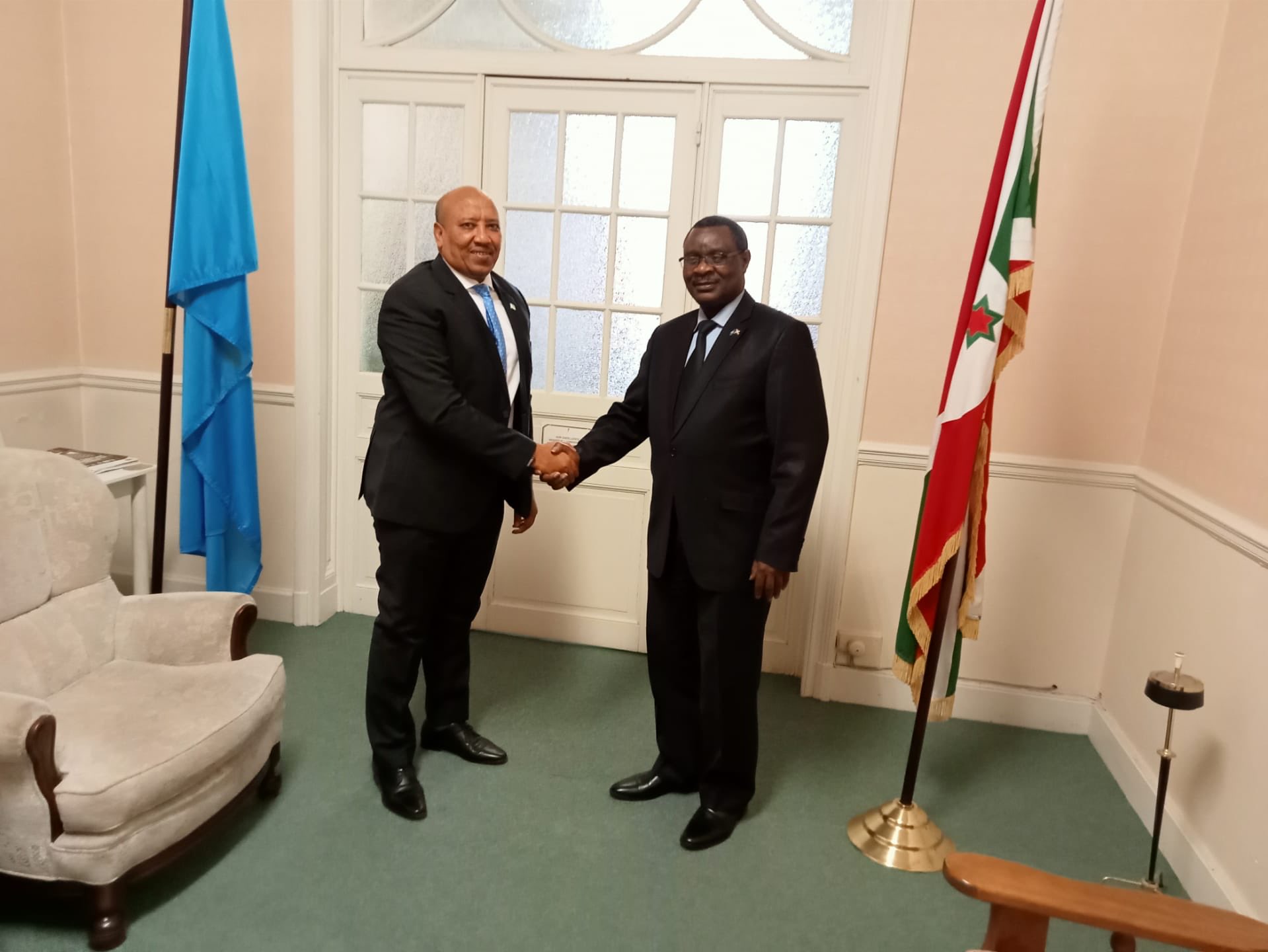 Amb. NTaHiRaJa Thérence, Ambassadeur du BuRuNDi en BELGIQUE, recevait chaleureusement et fraternellement, dans ses locaux , Amb. DeLeiTa ADeN, nouvel Ambassadeur de DJiBouTi en BELGIQUE. Lui souhaitant la bienvenue dans sa nouvelle fonction à Bruxelles, capitale de l’Union Européenne (UE). Commentant rapidement l’actualité de KaMa et les bouleversements observés en ce moment… Puis échangeant ensemble sur le renforcement de la coopération entre le BuRuNDi et DJiBouTi, notamment au niveau de leur mission diplomatique respective.