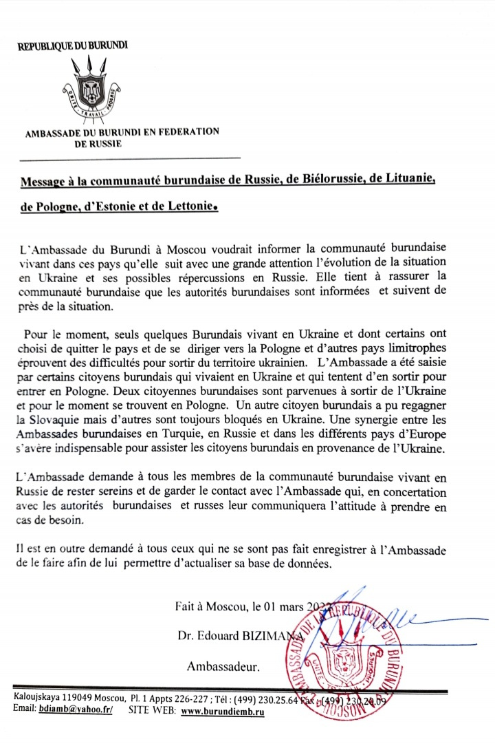 Amb. BiZiMaNa Edouard, Ambassadeur du BuRuNDi en Russie, expliquant dans un communiqué : “ Pour le moment, seuls quelques Burundais vivant en UKRAINE et dont certains ont choisi de quitter le pays et de se diriger vers la Pologne et d’autres pays limitrophes éprouvent des difficultés pour sortir du territoire ukrainien …“