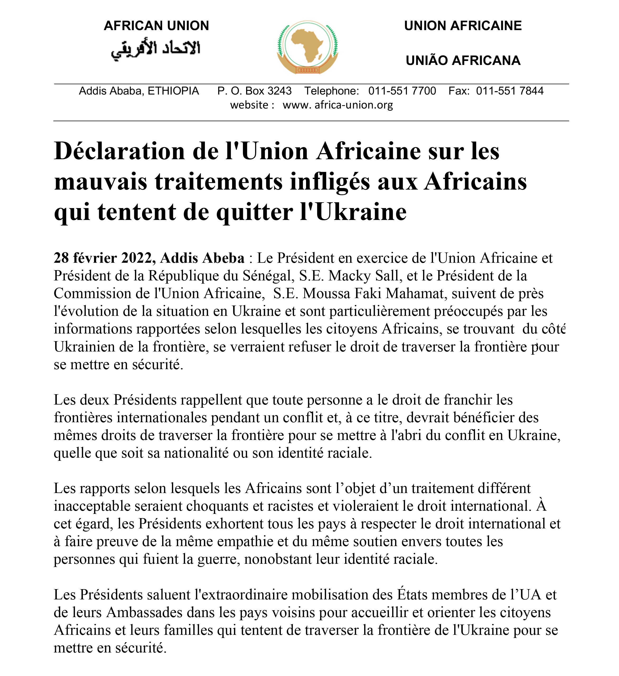M. FaKi Moussa, Président de la Commission de l’Union africaine (UA), a réagit en sortant un communiqué, dénonçant les mauvais traitements infligés aux Africains tentant de quitter l’UKRAINE.