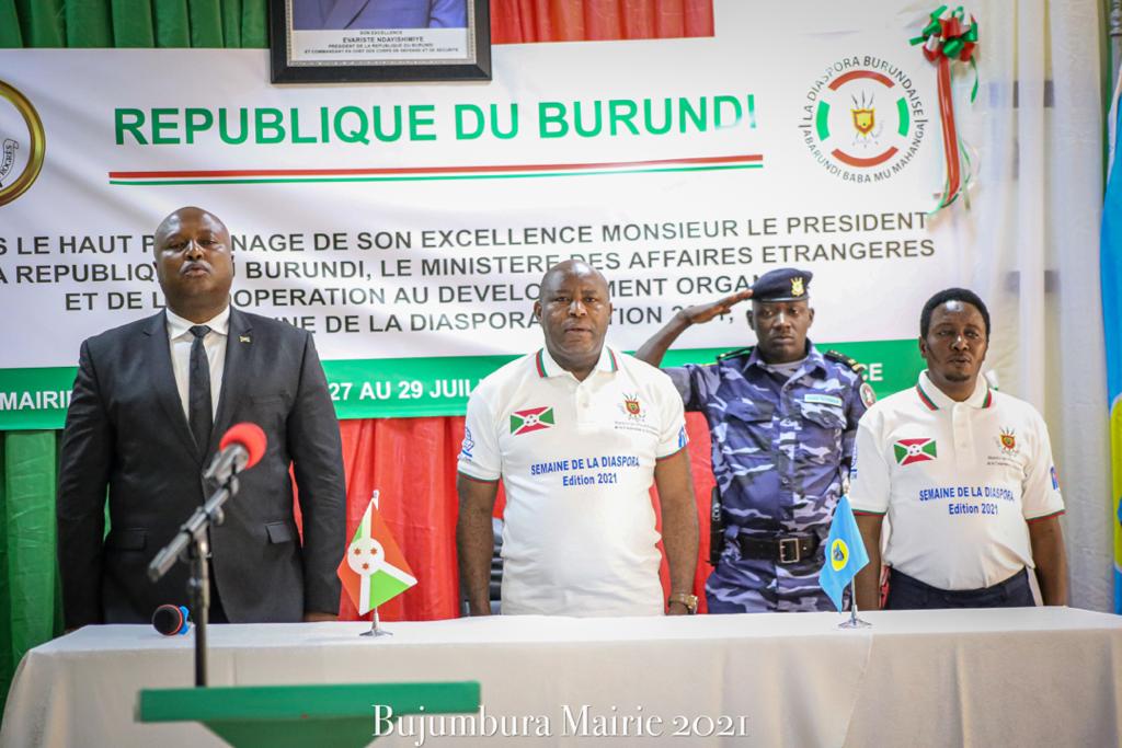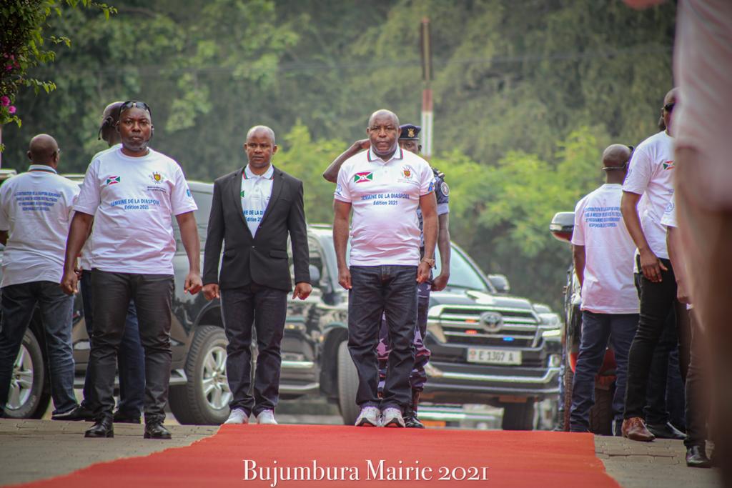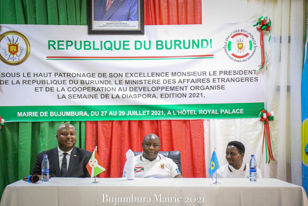 GLOBALISATION, DIASPORA – BUJUMBURA ( Royal Palace Hotel ), Mercredi 28 juillet 2021 – Cadrant avec LA POLITIQUE GLOBALE DES BARUNDI, issue de LA POLITIQUE ETRANGERE DES BARUNDI. Reçu par M. HATUNGIMANA Jimmy ( Commissaire de Police / Officier de Police Chef Première Classe – OPC1 ), Maire de la ville de BUJUMBURA. En présence de M. SHINGIRO Albert, l’excellent Ministre burundais des Affaires Etrangères et de la Coopération au Développement. S.E. NDAYISHIMIYE Evariste ( Général Major ), Président du BURUNDI, organisait une séance de moralisation,destinée aux membres de la diaspora burundaise, conduits par M. NDAYISHIMIYE Legentil Japhet, Représentant de la DIASPORA, présents à la Semaine de la Diaspora au BURUNDI, 5ème édition. Disant : ” Commencez à être de bons et fiers ambassadeurs en paroles, en refusant de propager des propos dégradant sur le BURUNDI … Nous devons connaître la vérité sur le passé mais il nous appartient de redéfinir l’avenir de notre patrie. Ceux qui tentent parfois de raviver les divisions sont à bannir. Ensemble, tout est possible .. “. Appelant à s’investir, chacun à son niveau, dans le développement socio-économique de leur patrie. Remerciant tous les Burundais vivant à l’étranger pour la participation massive qu’ils ont manifesté cette année.