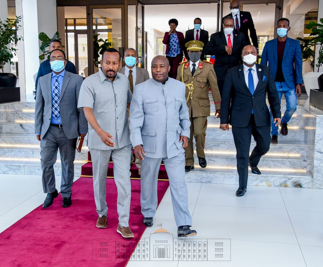 Accompagné de l’Hon. BuToYI Evelyne, Cheffe de Bureau et Porte Parole à la Présidence, de l’excellent Ministre burundais des Affaires Etrangères , M. SHiNGiRo Albert, et de M. NYaMiTWe Willy , Ambassadeur du BuRuNDi en Ethiopie et à l’Union Africaine (UA). S.E NDaYiSHiMiYE Evariste ( Général Major ), Président du BuRuNDi, a rencontré M. ABiY Ahmed Ali, Premier Ministre de l’Éthiopie ( Prix Nobel de la Paix 2019 ).