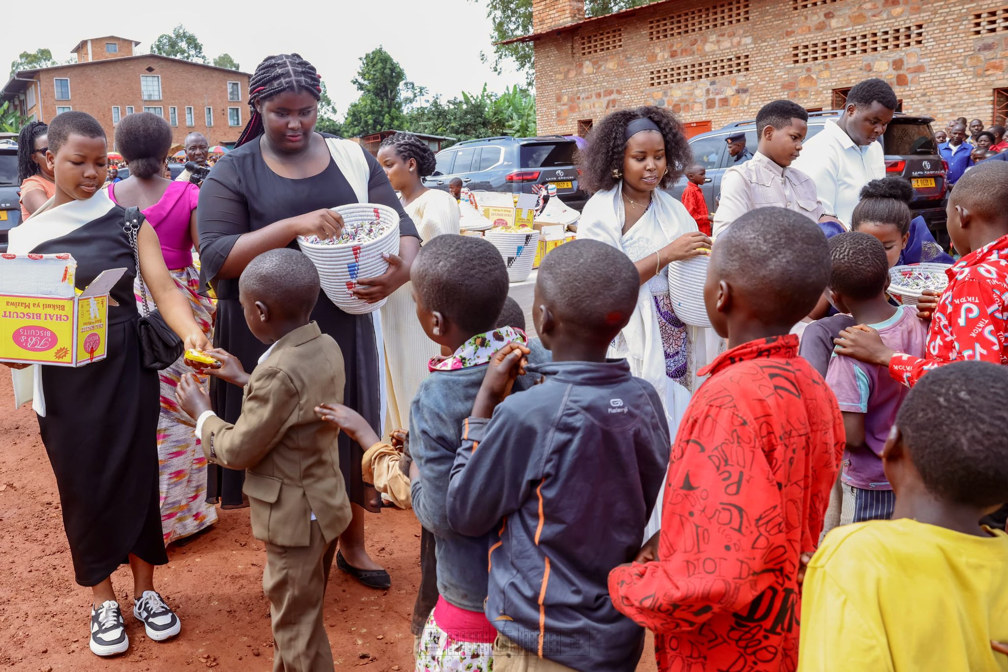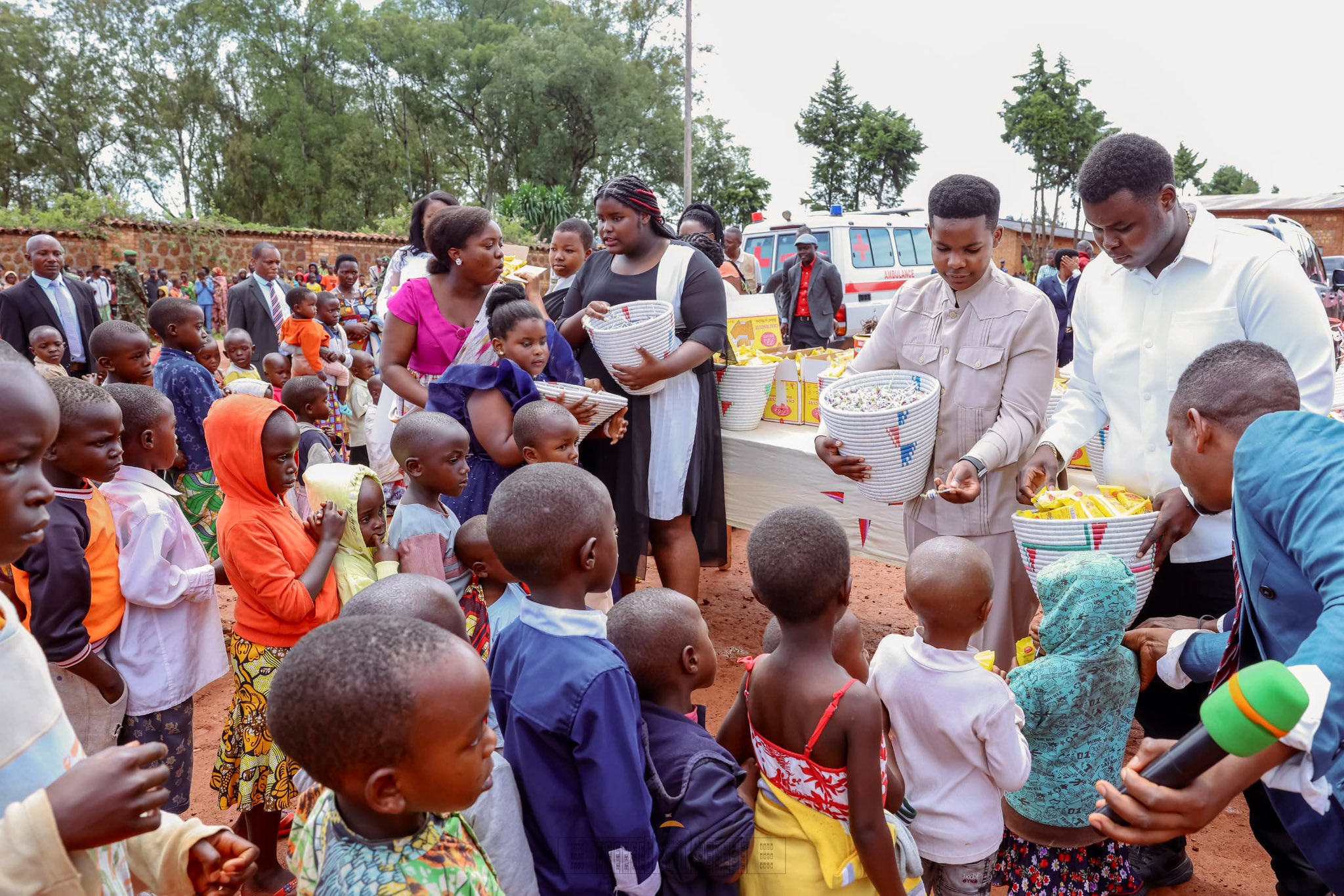 Après la messe, les enfants du Couple Présidentiel ont partagé de petits présents avec ceux de la paroisse Murayi.