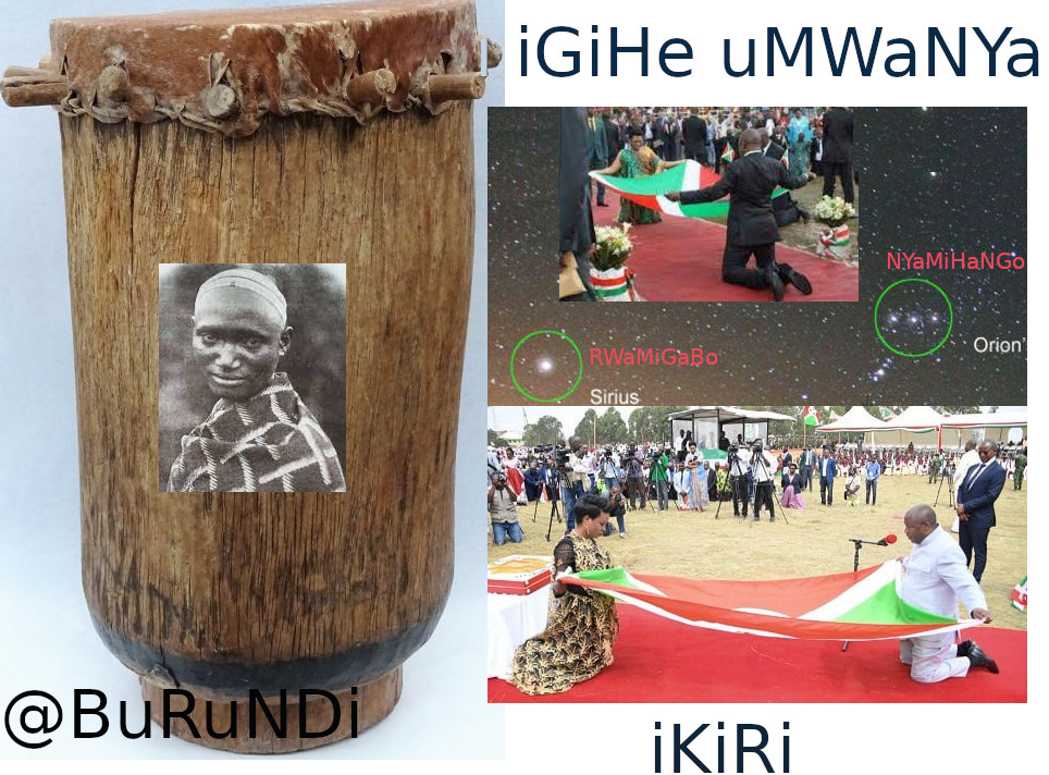 La fête de l’uMuGaNuRo débute au mois lunaire de “KiGaRaMa”[6] avec la rencontre particulière dans le ciel “iJuRu” entre Sirius “RWaMiGaBo” et Orion “NYaMiHaNGo”[5], symbolisant l’accouplement de MuKaKaRYeNDa et KaRYeNDa, en vue de concevoir iMaNa . Ce TEMPS de l’uMuGaNuRo est celui du MONDE INEXISTANT, NEANT, INVISIBLE, s’agissant du TEMPS de la CONCEPTION D’iMaNa ( “iSaMa, iSaMWa”) . C’est la naissance du – son -” uMWaSaNo, iJWi, aKaVuZe” dans le Tambour -iNGoMA.