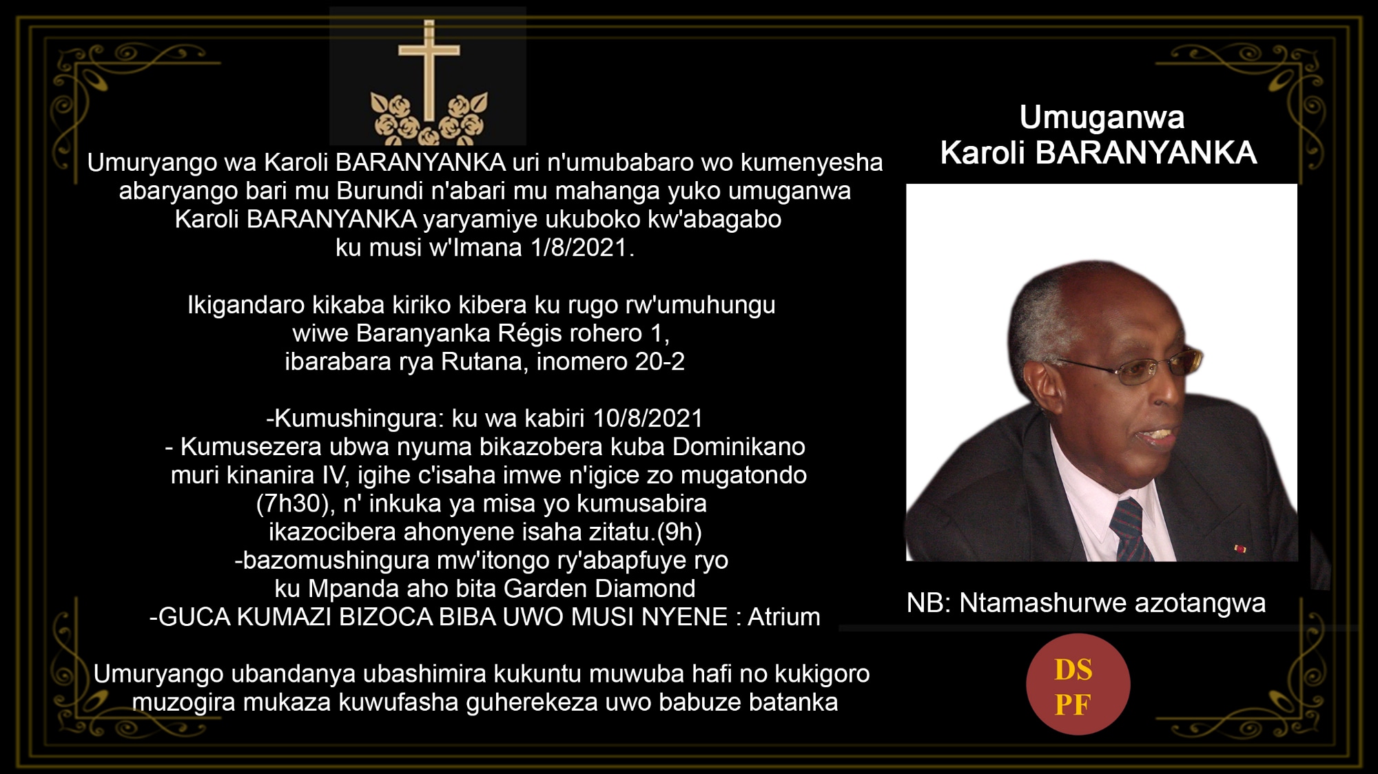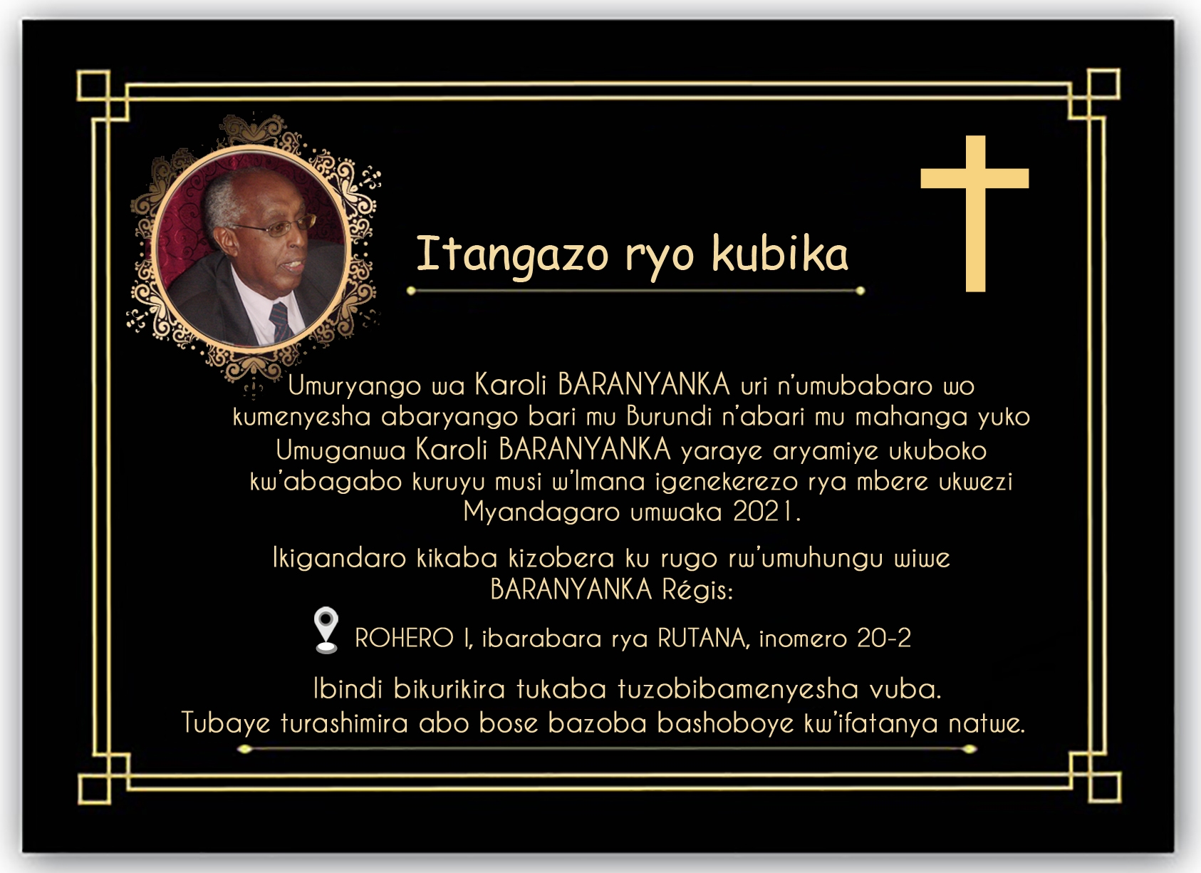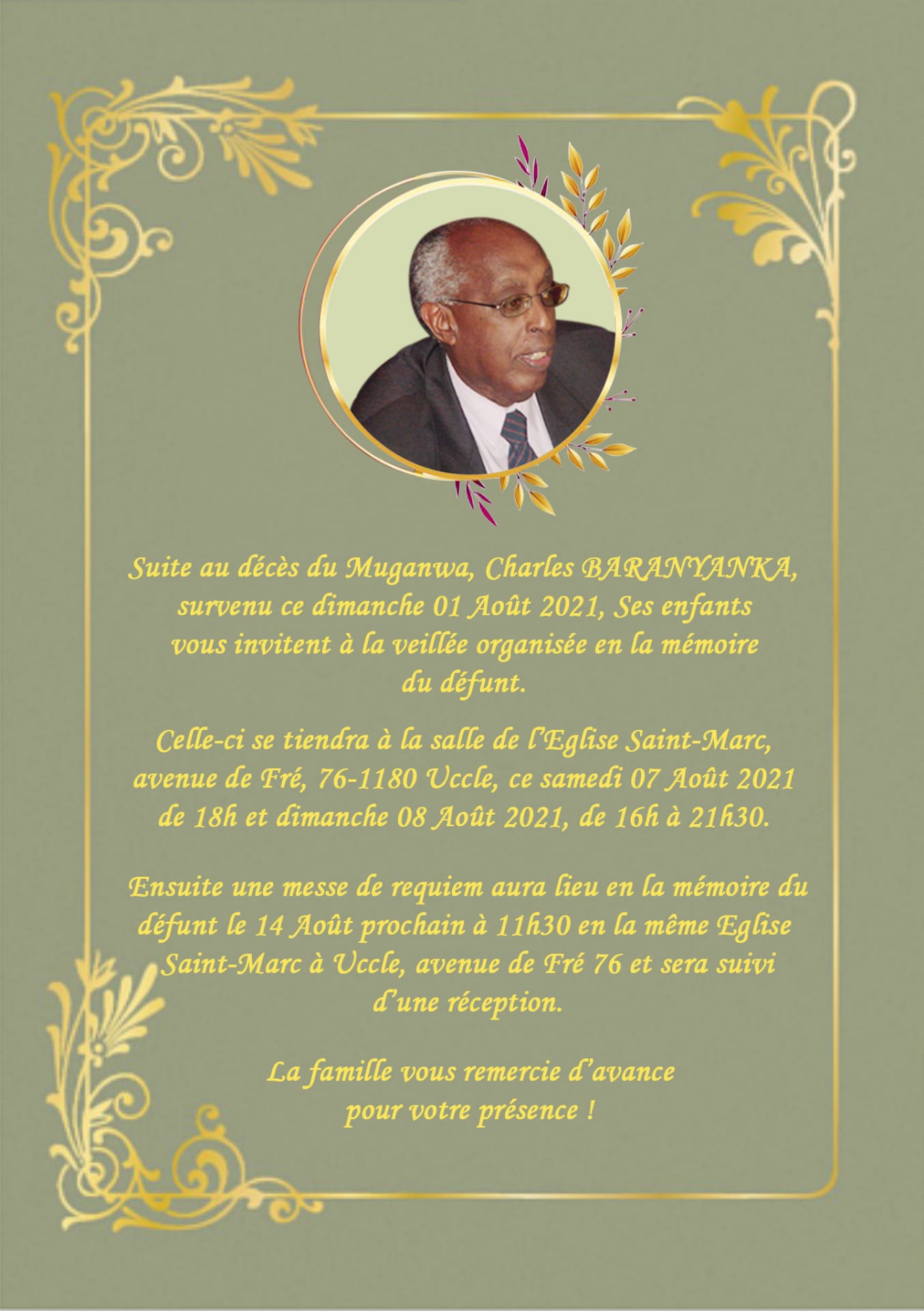 Suite au décès du Muganwa, BARANYANKA Charles [1], survenu ce dimanche 01 août 2021,ses enfants vous invitent à la veillée organisée en la mémoire du défunt.