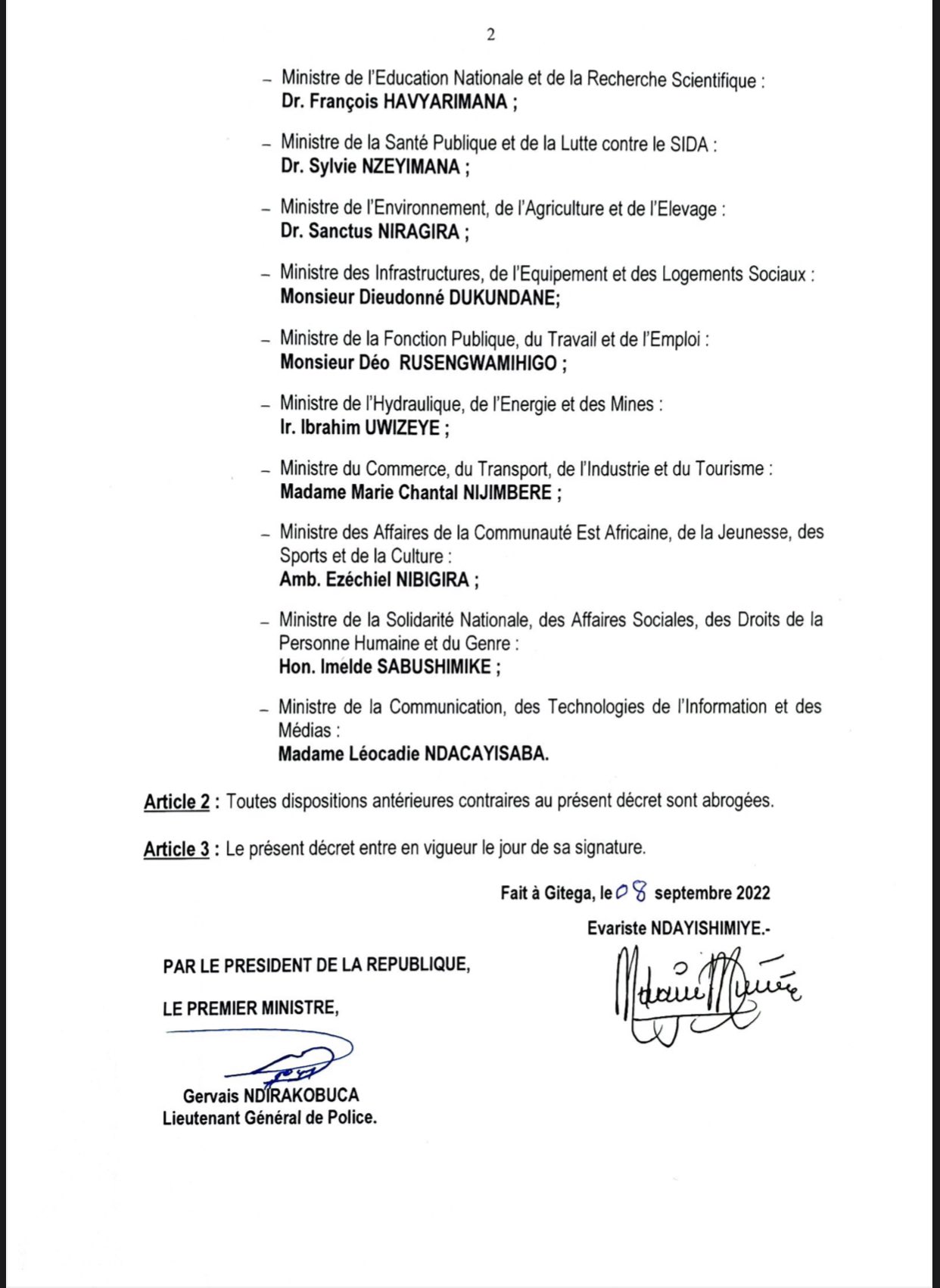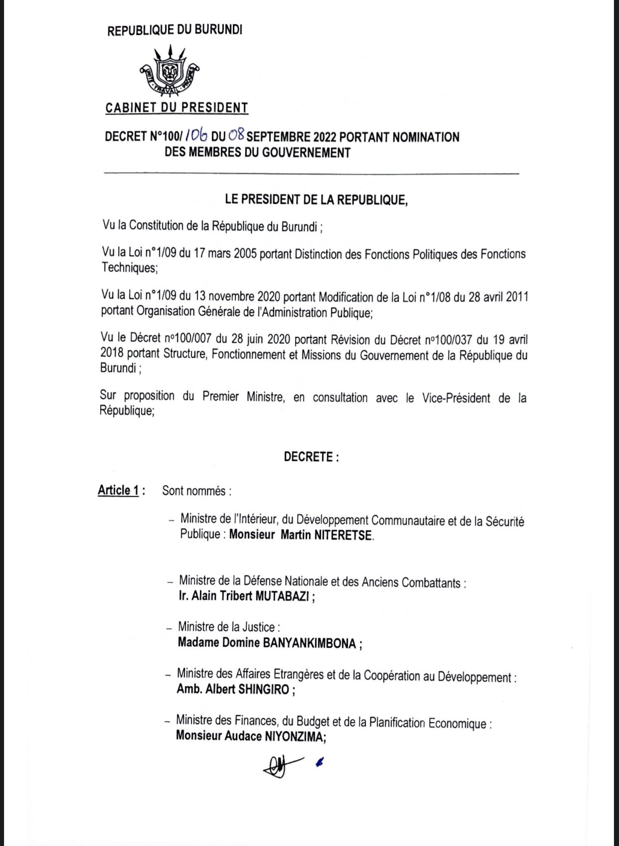 Voir le Décret : [ https://burundi-agnews.org/wp-content/uploads/2022/09/bdi_burundi_Decret-n-100-06-du-08-septembre-2022-portant-nomination-des-membres-du-gouvernement.pdf   ]