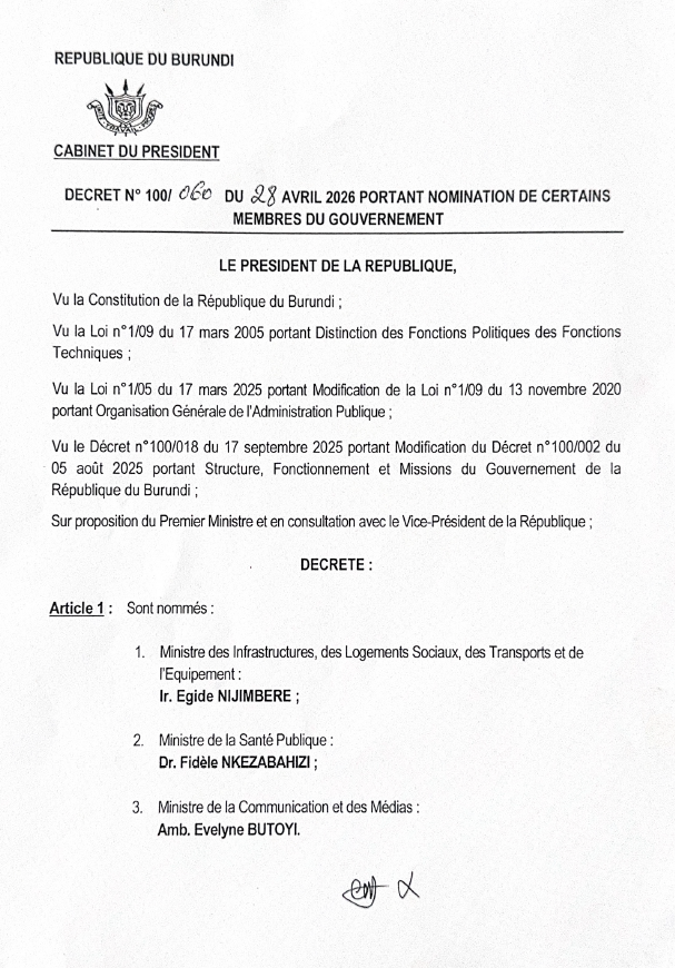 Gitega (Burundi), 28/04/2026 (BdiAgnews) – Par le décret n°100/060 du 28 avril 2026 portant nomination de certains membres du gouvernement, le Président du Burundi, S.E. Ndayishimiye Évariste, Général Major, a procédé à un réaménagement partiel de l’équipe gouvernementale, sur proposition du Premier ministre et après consultation du Vice-président de la République ; trois portefeuilles sont concernés, avec la nomination de Nijimbere Égide au ministère des Infrastructures, des Logements sociaux, des Transports et de l’Équipement, de Nkezabahizi Fidèle au ministère de la Santé publique, et de Butoyi Evelyne au ministère de la Communication et des Médias ; le décret précise que toutes les dispositions antérieures contraires sont abrogées et que le Premier ministre est chargé de son exécution, le texte entrant en vigueur le jour de sa signature à Gitega.