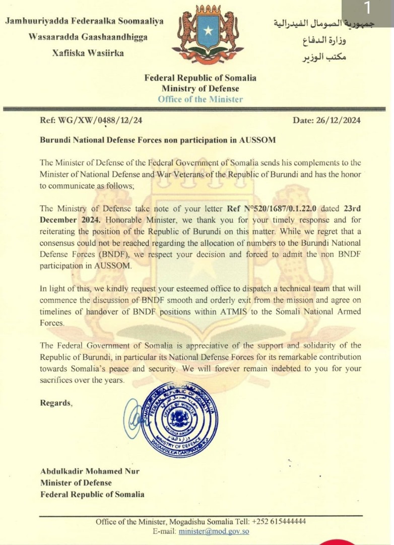 Mogadiscio (Somalie), 26/12/2024 – Par le biais d’un communiqué, le Ministre de la Défense de la République Fédérale de Somalie, M. Abdulkadir Mohamed Nur, a informé son homologue burundais qu’il avait pris note de la décision du Burundi de mettre fin à sa participation à la mission AUSSOM (African Union Support and Stabilization Mission in Somalia). Bien que regrettant l’absence d’un consensus sur cette question, la Somalie a déclaré respecter pleinement cette décision.