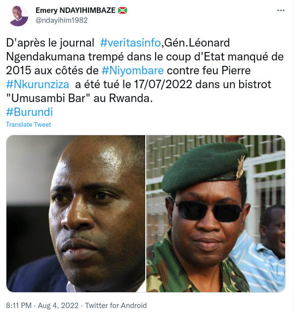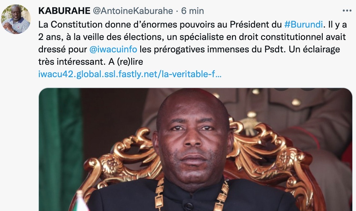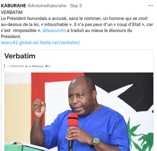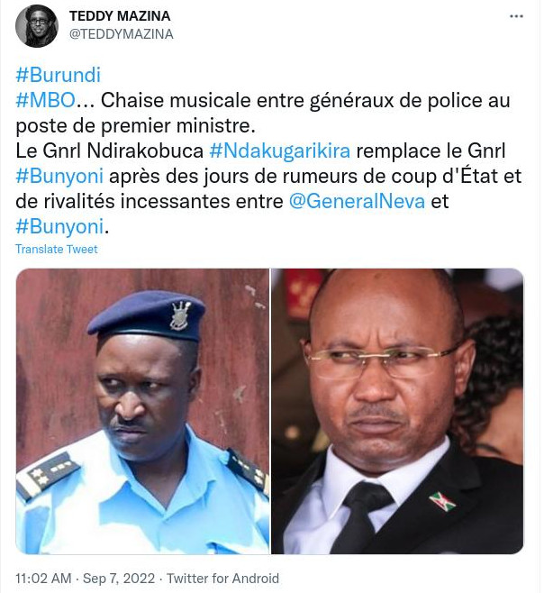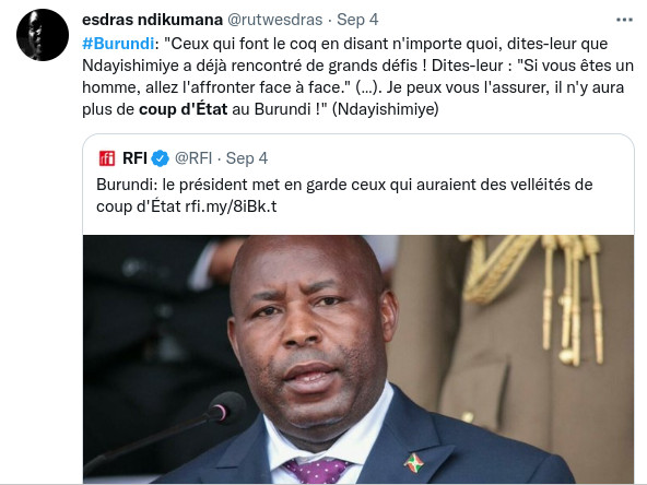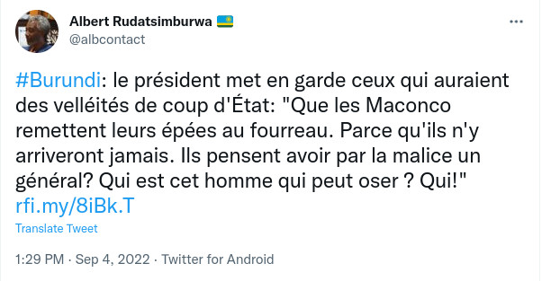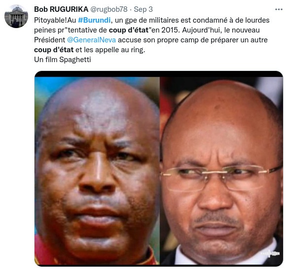 Avec l’aval de l’East African Community (EAC) dont de la RDC, la décision du régime de Gitega d’envoyer ses troupes en RDC Congo combattre le M23 ( Cfr. Rwanda ) et sécuriser le Sud-Kivu – , permettant d’empêcher cette localité d’être une base arrière pour attaquer le Burundi, une rumeur de tentative de coup d’état militaire au Burundi a été lancée sournoisement ces derniers jours, notamment par le réseau des activistes burundais exilés, issus des familles néo-colons burundaises et proches du régime de Kigali (Rwanda). Ce réseau essaie de distraire et fragiliser les Barundi dont le régime de Gitega … Car en ce moment, la Force de Défense Nationale du Burundi (FDNB) et la fameuse Force Armée de la RDC Congo ( FARDC ) font du très bon boulot au Sud-Kivu en RDC.
